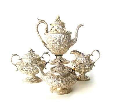 Comprising a coffeepot with a dome hinged lid and grape cluster finial, covered sugar bowl with grape cluster finial, and creamer, each of urn form with "C scroll handles and floral and foliate decoration together with a repousse teapot , stamped "Welsh and Bro." having a dome hinged lid and floral finial with a "C" scroll handle.