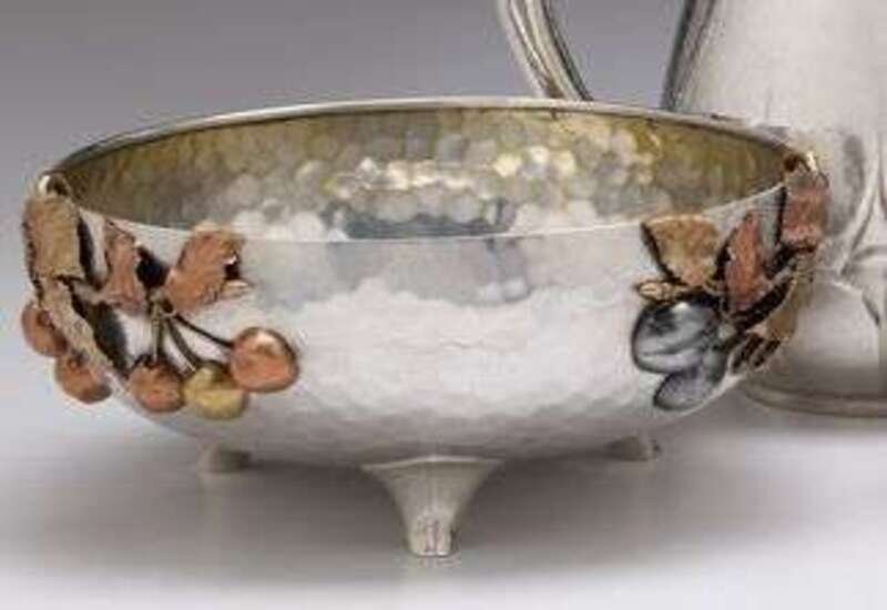 Of circular form with hammered honeycomb pattern and applied fruit vines, moth, and bird in flight decoration on short feet.