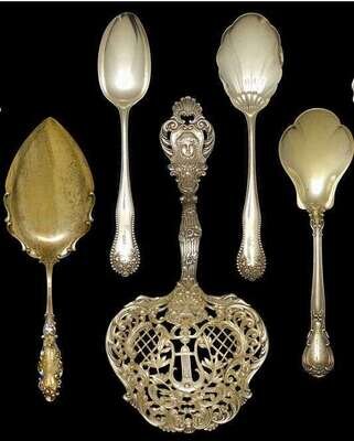 With mask decoration to handle and bowl and "C" scroll, lyre , and foliate decoration to bowl together with parcel gilt sterling silver fish server with enamel decoration to handle, parcel gilt scalloped edge serving spoon, a scalloped edge serving spoon, and a table spoon.