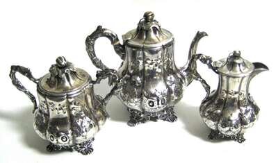 Pear shape with ribbed sides, floral and leaf repousse decoration on openwork and molded feet, melon finials to lids, including tea pot, covered sugar bowl and cream pitcher.