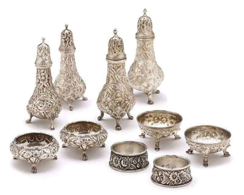 Having repousse decoration together with a pair of sterling silver repousse decorated open salts by A. G. Schultz & Co. and one pair of sterling silver repousse decorated salt and pepper shakers.