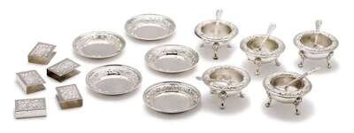 Of circular form and floral decoration to rim with three glass inserts and five salt spoons together with five Stieff repousse sterling silver match covers and circular ash trays all with floral and foliate decoration.