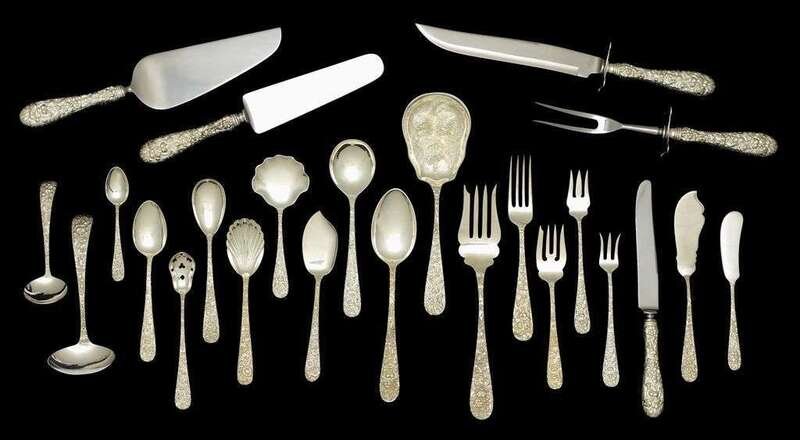 "Rose" pattern comprising twelve table knives, twelve butter knives, twelve dinner forks, twelve salad forks, twelve cocktail forks, twenty four teaspoons, eight cream soup spoons, six demitasse spoons, four table spoons, butter server, berry spoon, two piece carving set, gravy ladle, sauce ladle, cold meat fork, pie and cake server, two jelly servers, bon bon spoon, sugar shell, sugar spoon, olive spoon, two condiment forks, and a pastry server.