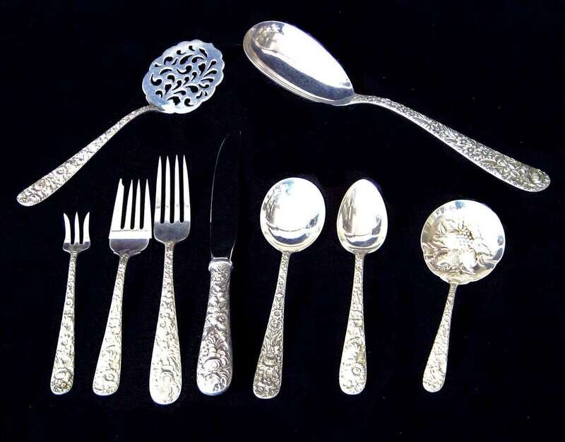 "Repousse" pattern comprising 6 dinner forks, 6 salad forks, 6 cocktail forks, 6 hollow handle dinner knives, 6 teaspoons, 6 cream soup spoons, 1 tomato server, 1 berry spoon, and 1 serving spoon.