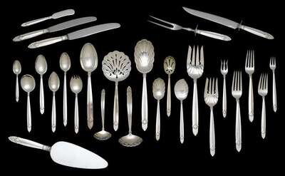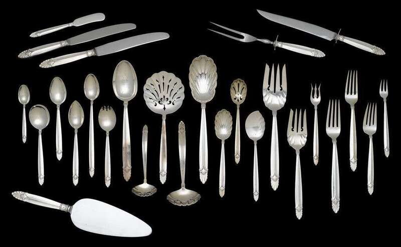 "Empress" pattern including 14 dinner forks, 12 luncheon forks, 12 salad forks, 12 cocktail forks, 10 ice cream forks, 27 teaspoons, 11 grapefruit spoons, 12 cream soup spoons, 12 iced tea spoons, 19 demitasse spoons, 14 hollow handle dinner knives, 11 hollow handle luncheon knives,16 flat handle butter knives, steak fork, steak knife, 6 tablespoons, 1 cold meat fork, 1 serving fork, 1 jelly spoon, 1 cake/pie server, 1 large berry spoon, 1 small berry spoon, 1 sugar shell, 1 gravy ladle, 1 sauce ladle, 1 flat server, 1 jelly spoon, 1 tomato server and two lemon forks.