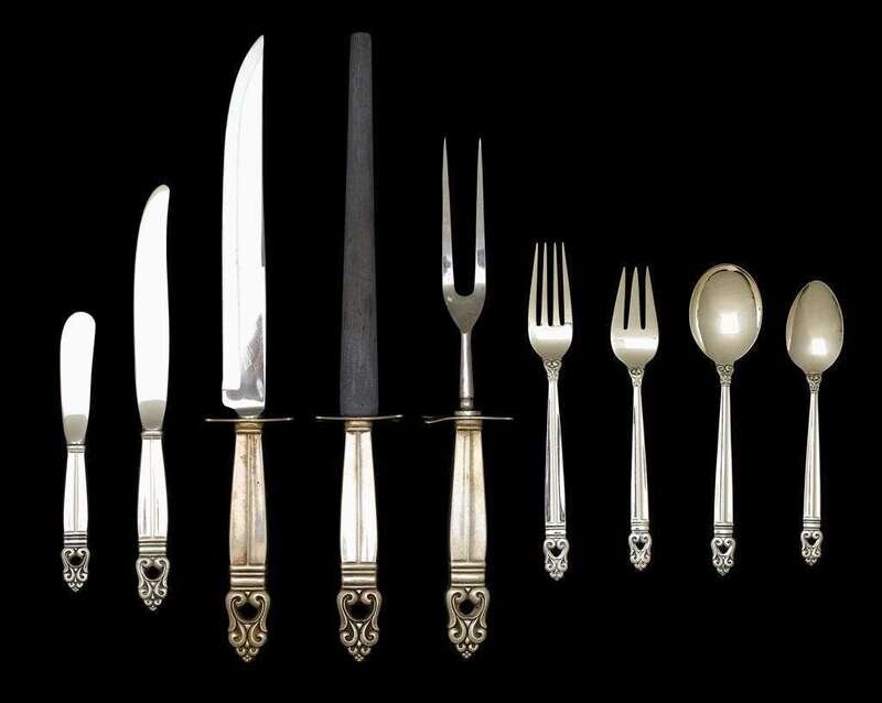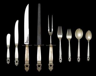 'Royal Danish" pattern including twelve place knives, twelve place forks, twelve salad forks, twelve dessert spoons, nine butter spreaders ( two are flat), eighteen teaspoons and three piece roast carfving set.