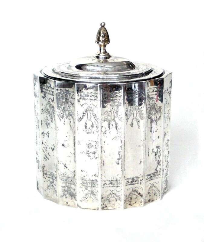 "Revere pattern," with an pineapple finial and oval domed hinged lid over a fluted oval body decorated with ribbon garland.