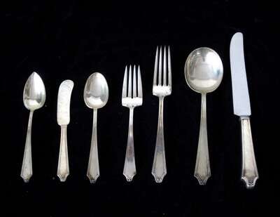 "Minuet" pattern including 10 dinner forks, 12 salad forks, 10 hollow handle dinner knives, 10 flat butter spreaders, 14 teaspoons, 5 graperfruit spoons, and 7 cream soup spoons.