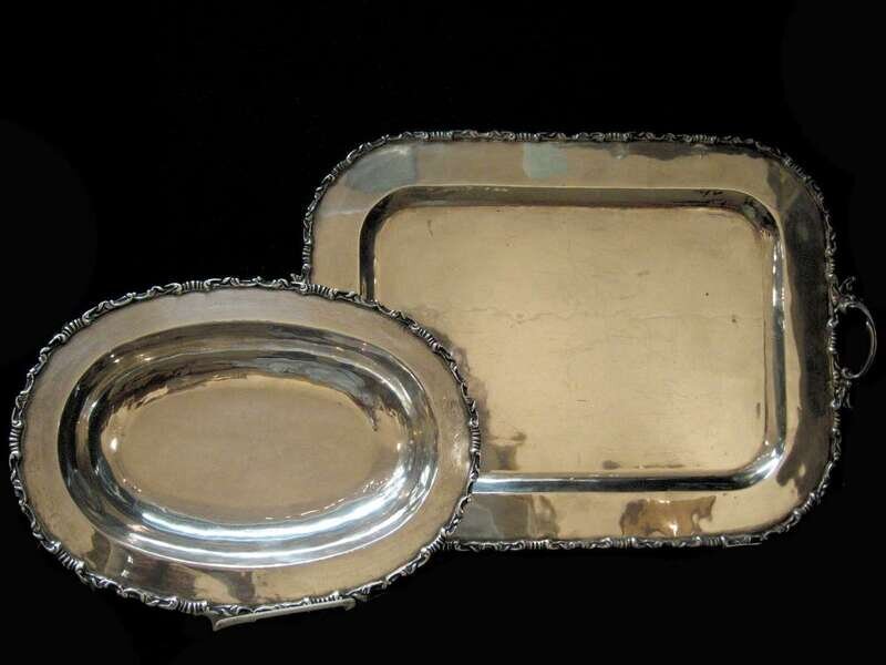 The rectangular tray with twin handles and oval bowl each with cast "C" scroll and shaped borders together with a rectangular shaped bowl with a molded edge, stamped, "Sterling Made in Mexico."