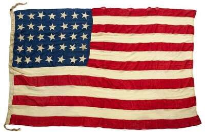 With wool canton and appliqued cotton stars, hand and machine sewn, the cotton hoist with inscription in ink, "Miss Brown."