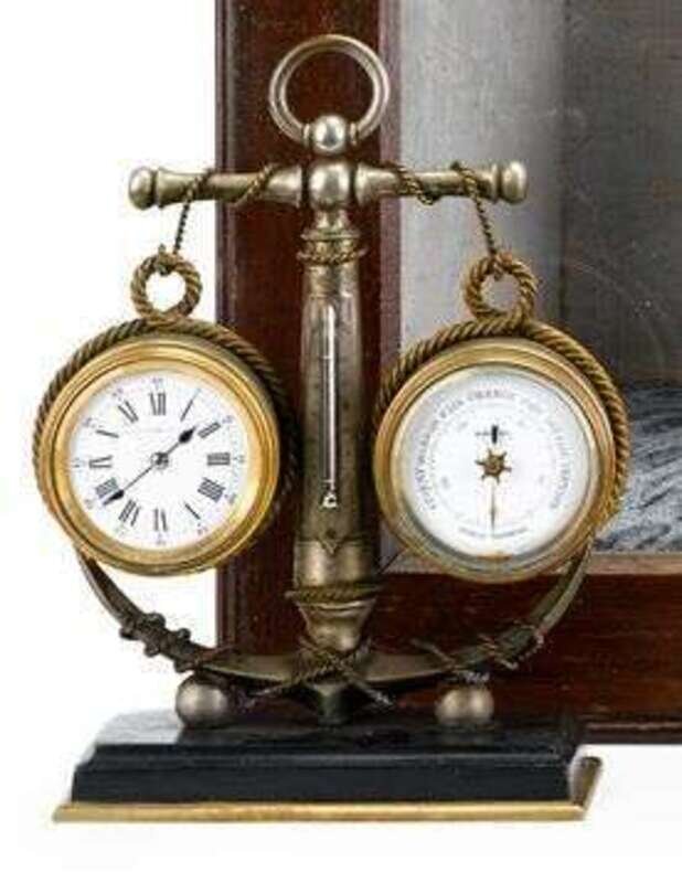 Having a metal anchor with rope decoration and thermometer flanked by a circular clock and barometer on black painted wood plinth base.