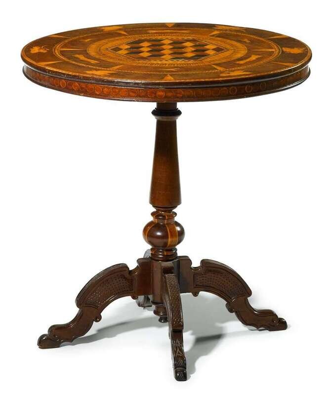 The circular top inlaid with clasped hands, horses and flowerheads enclosing a "tumbling blocks" center, the sides inlaid with "cat's eye" circles, raised on a turned and inlaid column terminating on arched chip carved eagle head feet.