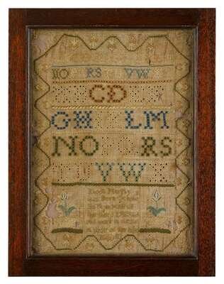 A strawberry border encloses rows of alphabet above inscription, "Rhoda Murphy was born October 26th in the year our lord 1767did this work the 16th year of her age, 1803," flanked by potted flowers, framed.