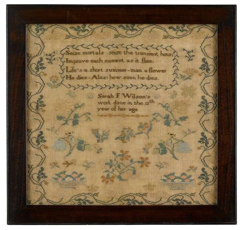 Needlework sampler "sarah f. wilson's work done in the 12th year of her age," burlington, nj.circa 1838