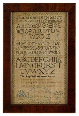 A strawberry border encloses rows of alphabet, pious verse, basket of flowers and inscription, worked with silk threads on a linen ground, framed.