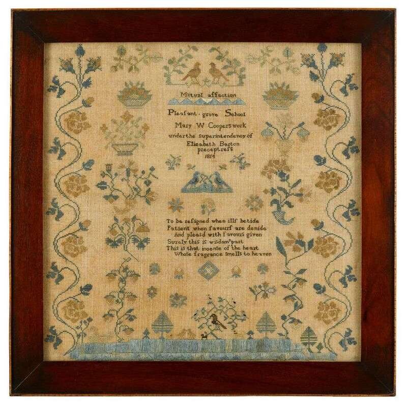 Inscription," Mary W. Cooper's work under the superintendency of Elizabeth Burton Preceptrefs, 1814 Pleafant Grove School," enclosed by undulating floral vine, verse, spot devices including birds, baskets of flowers and hillock with trees, framed.
