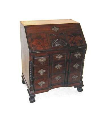The slant top carved with shell and raised panels opening to fitted interior above three blocked drawers, ball and claw feet.