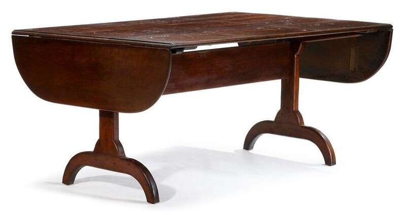 Shaker maple drop leaf trestle dining table watervliet, new york, circa 1840