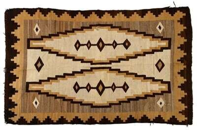 Woven with pattern of stepped diamonds within a stepped sawtooth border in shades of brown, natural and umber.