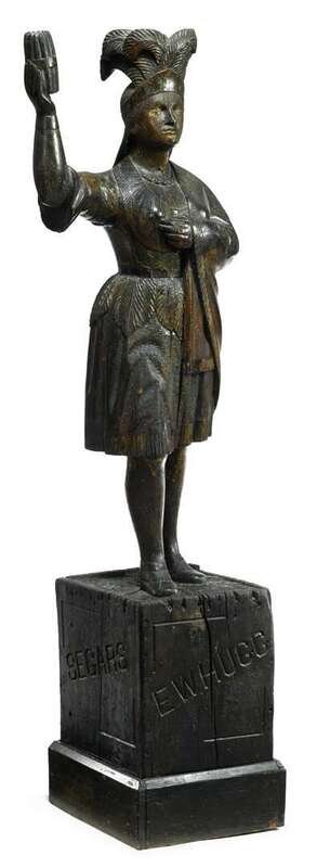 The figure holds a bundle of cigars in raised arm and blanket in the other, retains traces of paint, base carved with the inscription "E.W. Hugg, Segars and Tobacco."