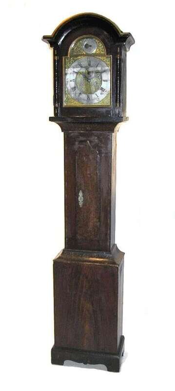 The arched hood with turned pilasters above peaked waist door and a deep plinth on bracket base.