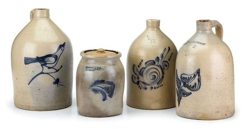 Including a three gallon jug decorated with a bird, a two gallon jug marked "White's Utica, N.Y." decorated with a flower, another two gallon jug ,marked "Fort Edwards," decorated with a flower and a jar marked , "Cowden & Wilcox Harrisburg, Pa."