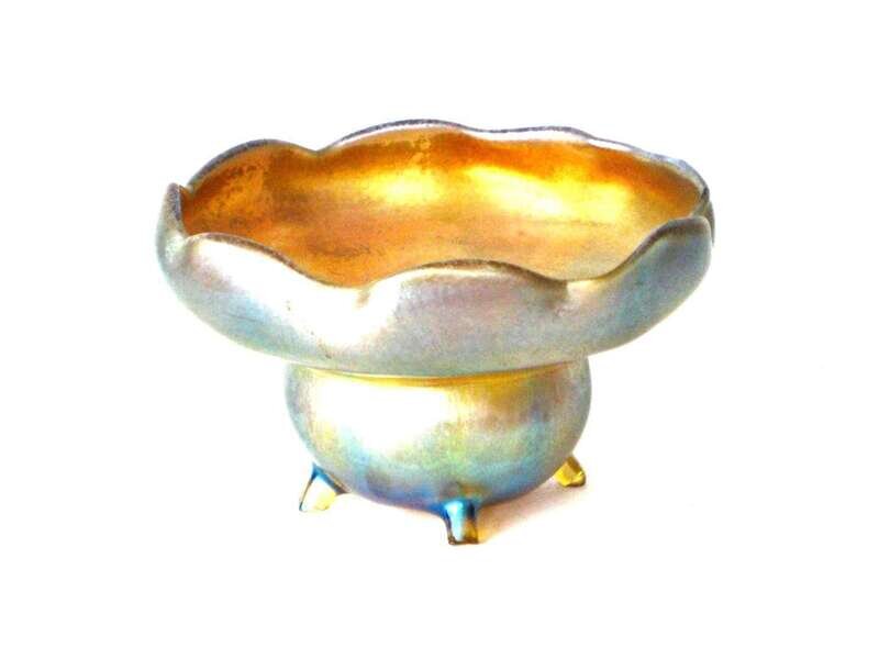 Engraved "L..C. Tiffany Favrille 7585C' , the wide scalloped edge tapers to a spherical base and four feet.