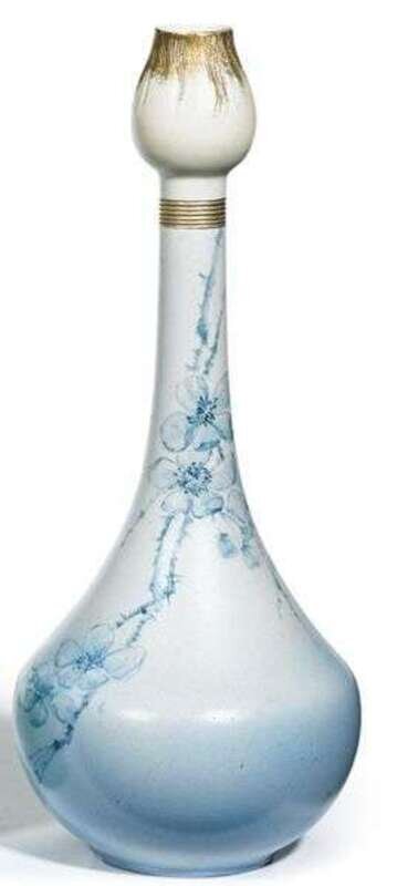 Incised bulb- form on long neck and swelling base, painted with blue flowers and gilt heighlights.
