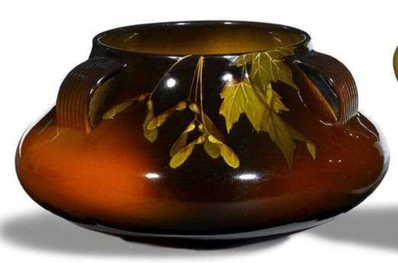 Of squat form with reeded strap handles, decorated with maple leaves and seeds.