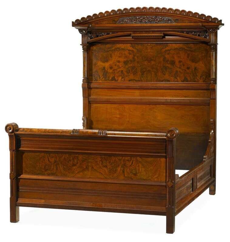 The headboard with scalloped flower-carved and punch-worked cresting above open-worked brackets and burled panel, turned columnar posts, turned and paneled footboard, paneled rails.