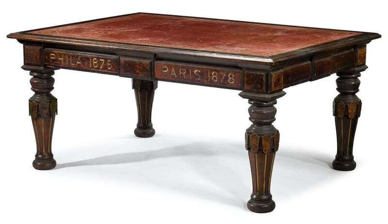 The rectangular top fitted with leather insert above apron incised and gilded with "Philadelphia 1876" and "Paris 1878" on turned, carve and incised tapering legs.