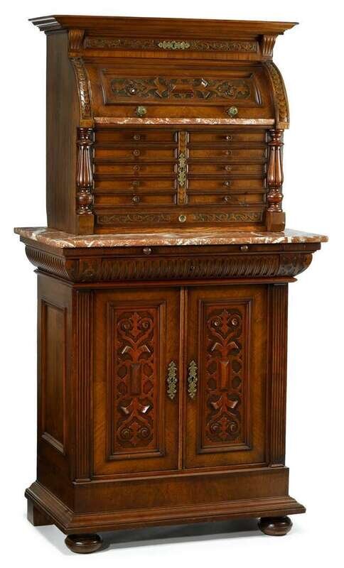 In two sections, carved with strapwork and punchworked panels and fluted pilasters, the upper section with roll top and ten shallow drawers, the lower section with pull-out tray, bolection drawer and double doors, all raised on turned feet.