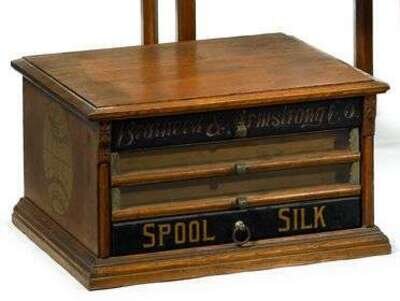Painted, incised and glazed oak silk thread display cabinet brainerd & armstrong spool silk, circa 1890