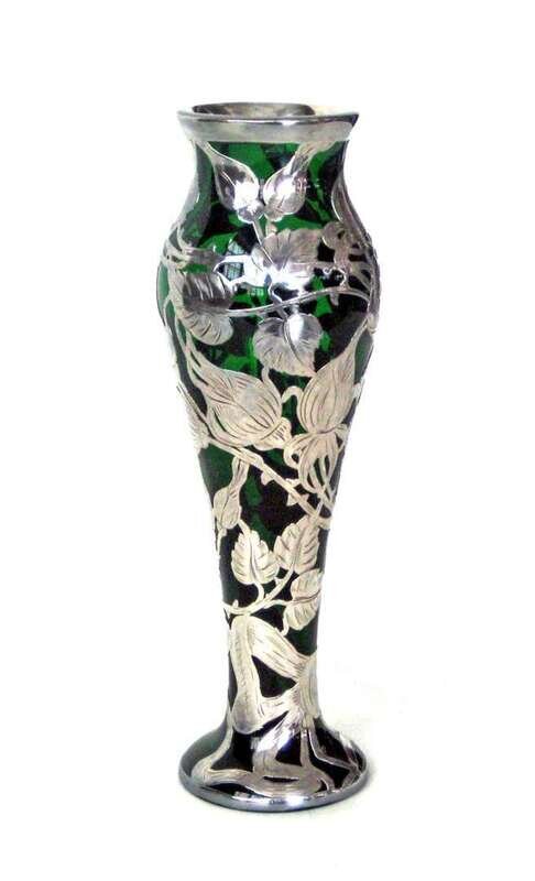 Inverted slender pear shape decorated with single large flower and vine with leaves.