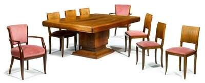 The rectangular top over a center support on a stepped base together two armchairs and four side chairs each having a straight crestrail on tapering legs.