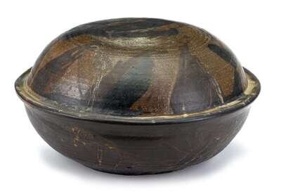 The brown glazed sculpture of a wide bowl form with an everted rim sealed to a domed lid, unsigned.