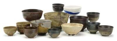 Comprising an unusual blue and white bisque bowl and thirteen mottled brown bowls; all signed.