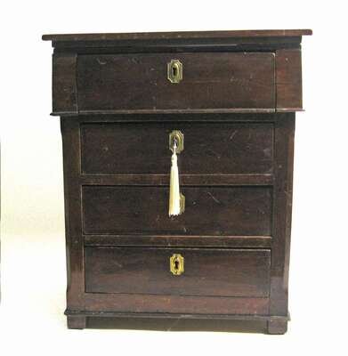 The rectangular top above outset drawer and three recessed drawers, flanked by chamfered corners, turned feet.
