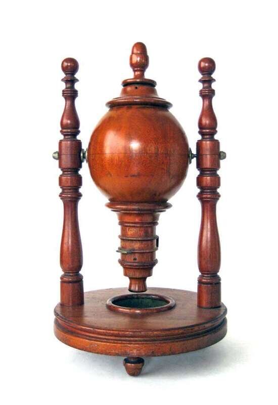The turned finial on spherical body and tapering ringed base pivots on turned posts, circular molded base with central recess, on turned feet.