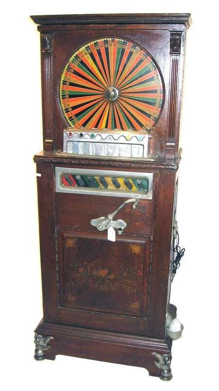 The dark stained oak case with molded cornice and glazed front enclosing roulette wheel, coin slots and crank below, molded base with winged mask cast feet.