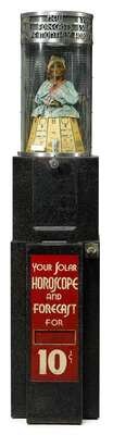 The nickel plated lettering "Your Solar Horoscope New Forecasts Monthly" surmounts arched glass case enclosing mechanical gypsy figure on a enameled base and enameled sign, paper fortunes includes with machine.