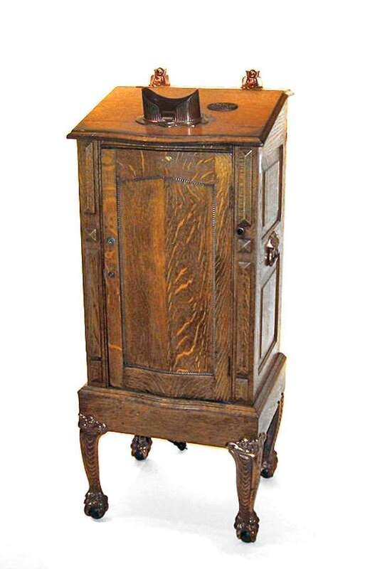 The oak case with patinated cast metal legs and hardware, with rotating photographs of young ladies, crank operated.