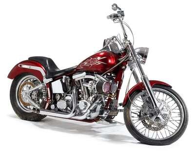 Year 2000 having a red telescopic front end, modified Harley Big Twin motor and custom intake with dual S & S carbs and straight pipes with a custom soft tail frame and a wide rear tire providing a smoother ride than a rigid frame bike. Harley running a switch gear with custom front wheel and brakes.