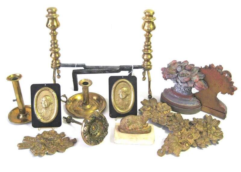 Including five stamped brass drapery ornaments, a stamped brass tieback, a pair of rectangular brass plates with relief portrait of George Washington, a cast brass lamb mounted on marble, a small pair of brass andirons of turned form on arched spurred legs and ball feet, and two brass chamber sticks, together with pair of carved wooden bookends in the form of a vase of flowers.