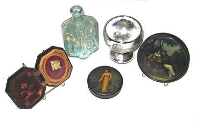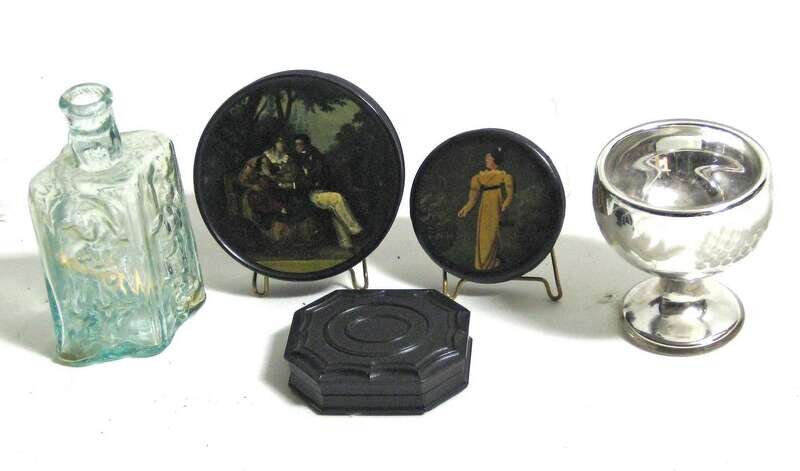 Including two lacquered snuff boxes, the first decorated with a man, woman and child; the second, with a young lady in an Empire style dress, a blown molded pale blue bottle with Indian figures (Samoset), an etched mercury glass goblet and a tiny doll in an octagonal daguerreotype case.