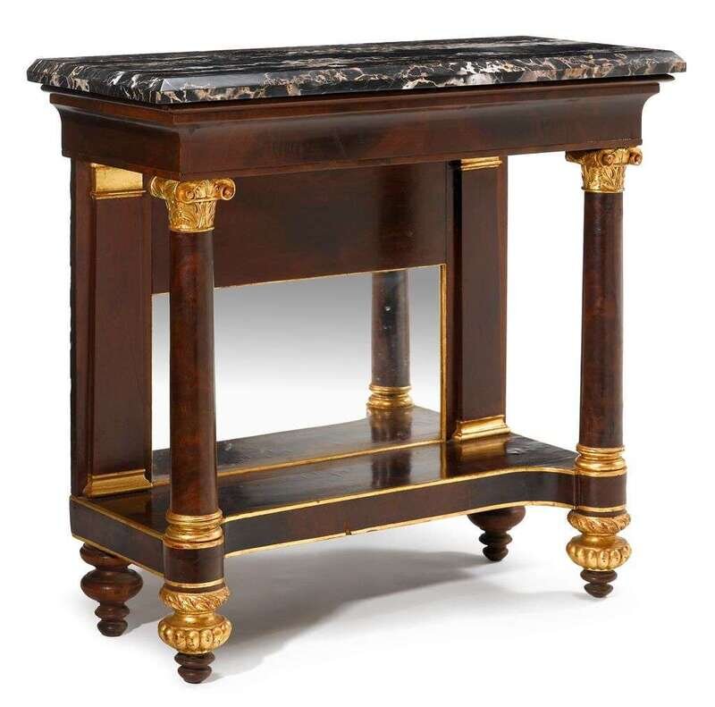 The black marble top on cove molded apron and tapering veneered supports with gilded ionic caps and cuffs, beaded feet joined by recessed platform, mirrored back.
