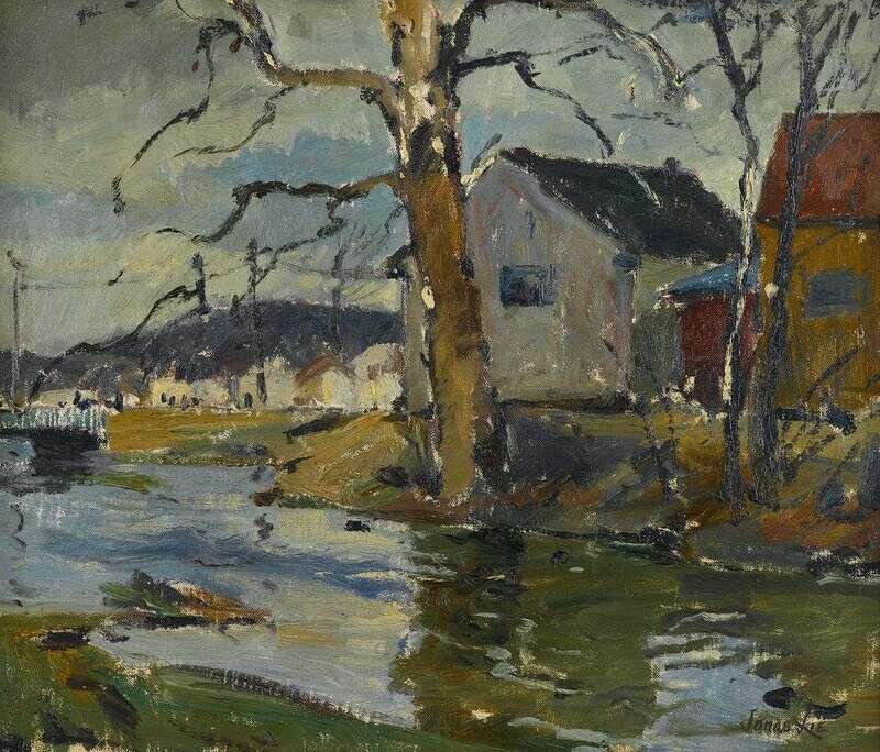 JONAS LIE (AMERICAN 1880-1940) HOUSES BY A RIVER