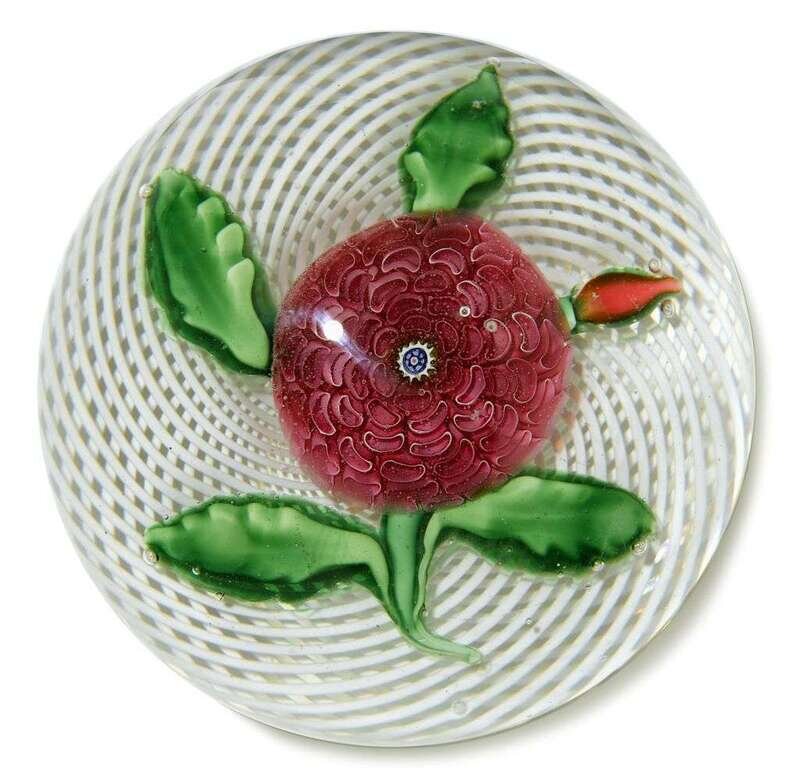 With a central pink pompon and cane center, with four green ruffled leaves and a pink bud, on a white latticinio basket.
