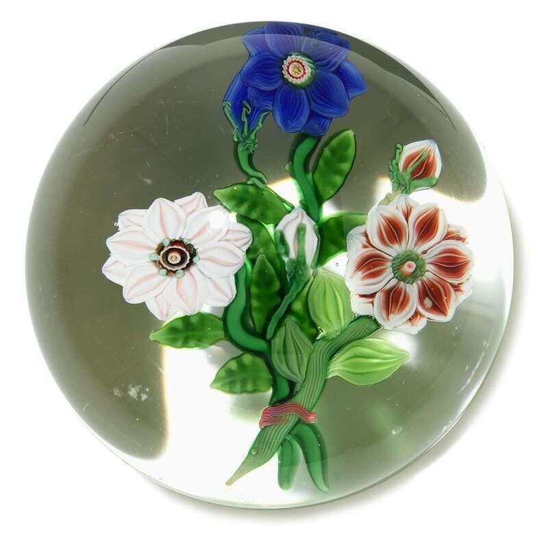 Antique Clichy triple clematis flat bouquet paperweight