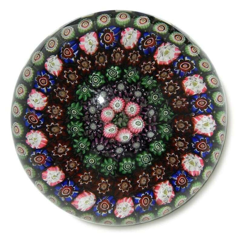 With a central green cane, enclosed by six rings of various colored canes, including a ring of spaced white and pink "Clichy" roses.